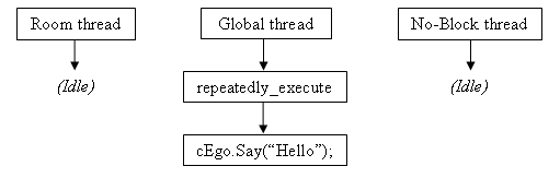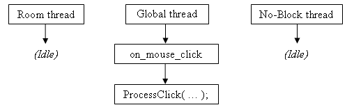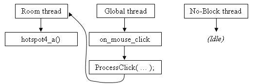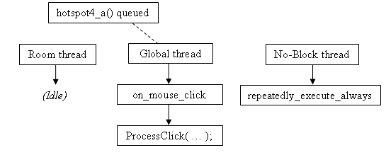 However, this is not the case. It is still the global thread that is calling ProcessClick, so the room script will actually be run on the global thread once it is free.
